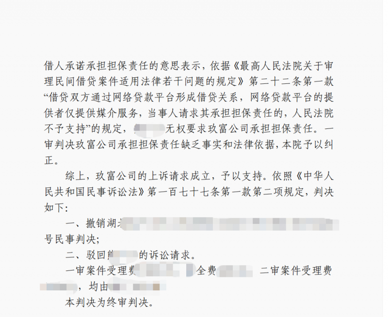 经过审理,湖北省中院认为现有证据表明案涉借款合同中的还款保障措施均明确指向由第三方保险公司或担保公司提供,玖富公司仅作为信息中介与相关方合作引入此类服务,其与出借人签订的协议亦明确排除自身提供担保的承诺;依据《最高人民法院关于审理民间借贷案件适用法律若干问题的规定》第二十二条第一款,网络贷款平台仅提供媒介服务时,出借人请求其承担担保责任于法无据,故一审判决认定玖富公司承担担保责任错误,应予纠正。最终湖北省中院裁定,玖富公司与熊某之间属于居间服务合同关系关系,且不承担担保责任,驳回熊某的诉讼请求。