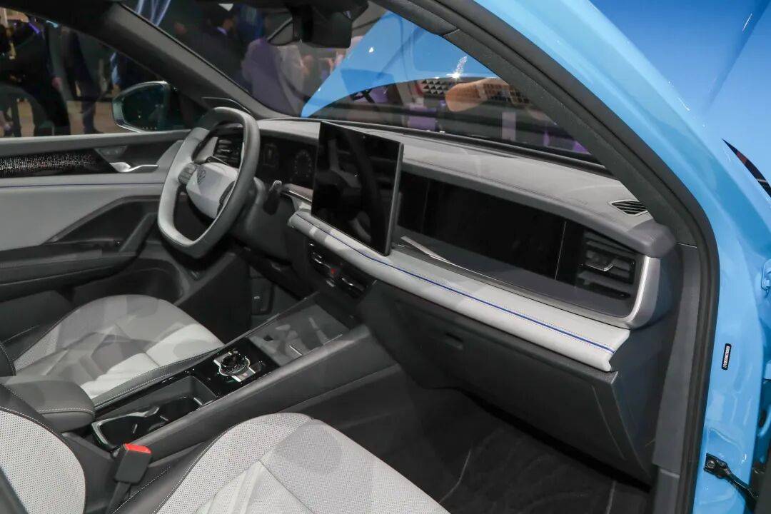 内饰方面,全新探岳L PHEV与燃油版保持高度一致,但取消了中控屏下方的触控区域,换装了全新样式的双辐平底方向盘,并继续采用旋转式电子怀挡换挡机构。科技配置方面,新车配备10.25英寸液晶仪表、15英寸中控屏和11.6英寸副驾娱乐屏,内置高通骁龙8155车机芯片,支持CarPlay和CarLife手机互联功能。舒适性配置上,前排座椅加热/通风、哈曼卡顿Harman/Kardon扬声器以及科大讯飞语音解决方案等均有搭载,提升了驾乘体验。