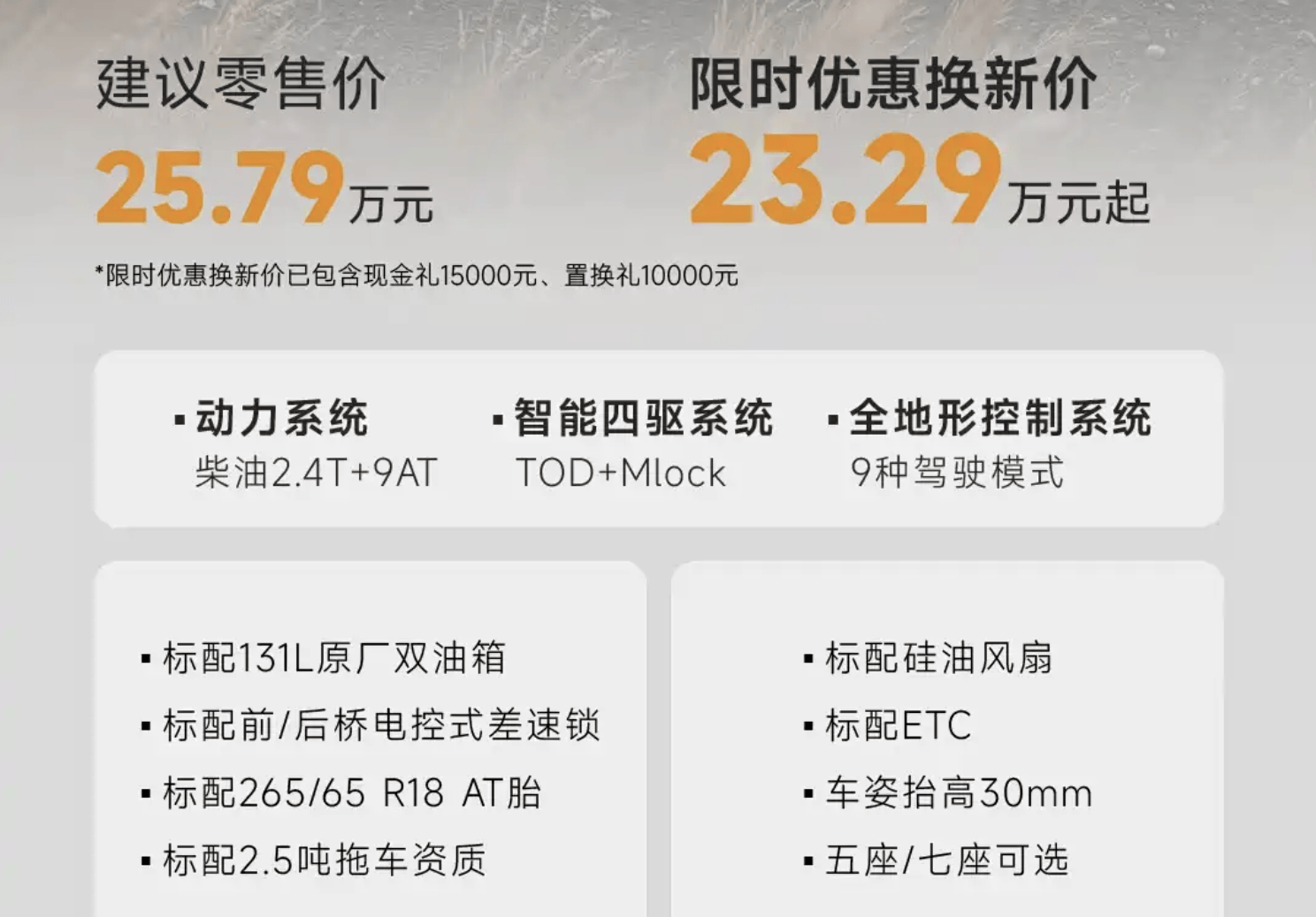 动力系统延续现款2.4T柴油发动机配置,最大功率137kW,峰值扭矩490N·m,匹配9速自动变速箱。续航能力方面,131L原厂双油箱设计使满油续航里程突破1400公里。四驱系统采用博格华纳TOD适时四驱,提供标准、经济、运动、雪地、泥地、沙地、4L、岩石、专家共9种驾驶模式,其中岩石模式与专家模式为新增选项。车辆具备2.5吨拖车资质,进一步拓展使用场景。