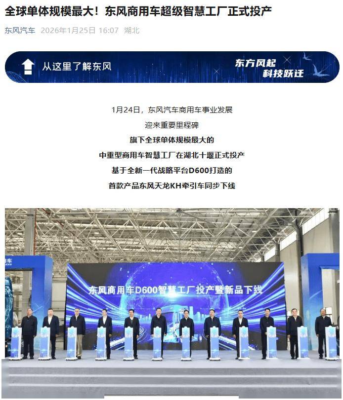 东风汽车在商用车领域迎来重大突破,其位于湖北十堰的全球最大中重型商用车智慧工厂正式启动运营。这座以数字化、智能化为核心的新型工厂,同步下线了基于D600战略平台打造的首款产品——东风天龙KH牵引车,标志着东风新一代商用车平台进入规模化量产阶段。