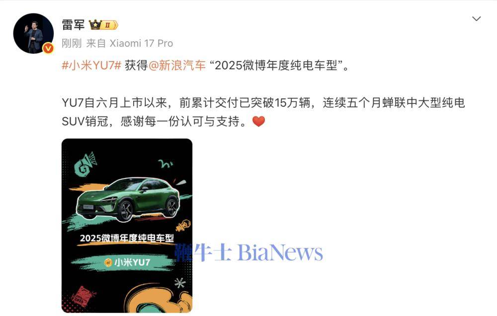 近日,小米公司再传捷报,其旗下纯电车型小米YU7荣获新浪汽车“2025微博年度纯电车型”殊荣。小米创办人、董事长兼CEO雷军通过社交平台分享了这一喜讯,并对市场及消费者的支持表达了诚挚感谢。