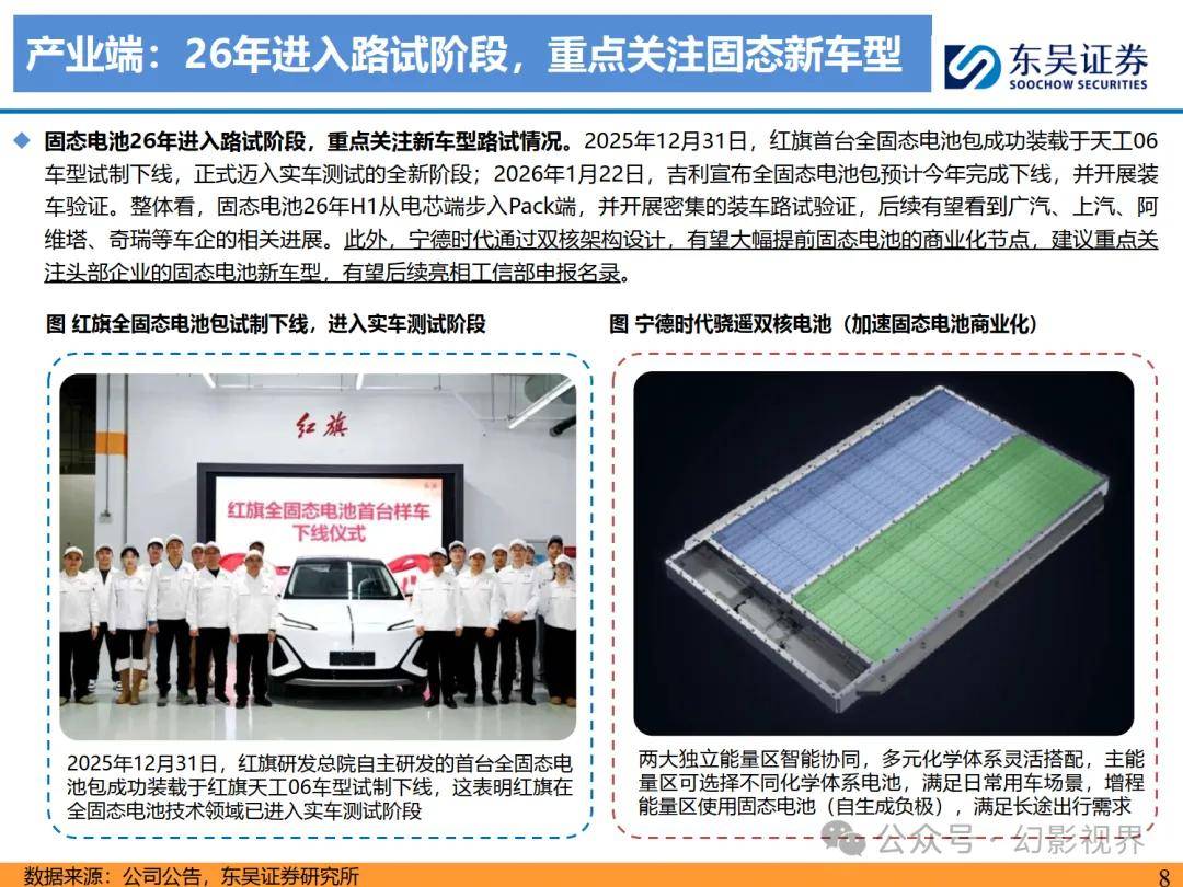 根据研究团队的分析,2026年固态电池发展将进入实质性验证阶段。上半年预计完成车规级Pack系统下线,随即启动装车路试工作;下半年量产生产线有望正式落地。值得关注的是,GWh级量产线的招标活动与主流车企的固态电池车型申报将成为核心催化剂,其市场影响力或将超越2025年的两轮行情。报告建议投资者密切跟踪头部企业的产线建设进展,以及工信部新车申报目录中的技术参数变化。