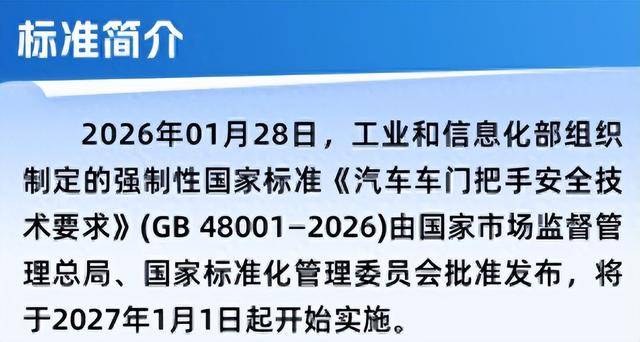 为规范车门把手设计,工业和信息化部于2026年1月28日发布了强制性国家标准《汽车车门把手安全技术要求》(GB 48001-2026)。该标准明确要求,每个车门(不含背门)必须配备机械释放车门外把手,确保在安全气囊展开或动力电池热扩散等紧急情况下,乘客仍能通过机械方式开启车门。同时,车内也需配备至少一个独立操作的机械释放内把手,且安装位置需直观可见、无遮挡。