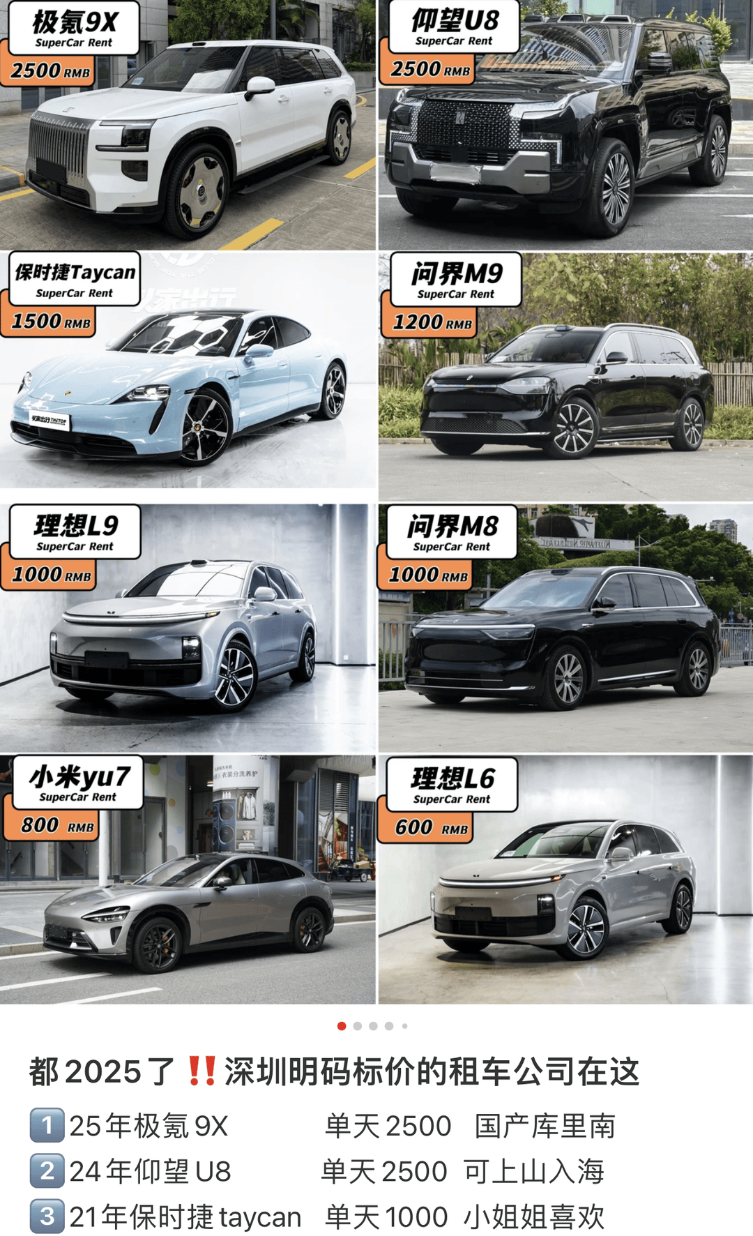 国产豪华新能源车型不仅在销售市场表现亮眼,其热度也迅速传导至春节租赁市场。数据显示,部分国产豪华新能源车型单日租金已突破1500元,个别热门车型甚至达到2100元以上,三天起租价格可达7000元。这一价格水平不仅超越了宝马、奔驰等传统豪华品牌的同级车型,甚至与保时捷、玛莎拉蒂等超豪华品牌的租赁价格形成竞争态势,彰显出豪华电动车型在租赁市场的认可度正在快速提升。