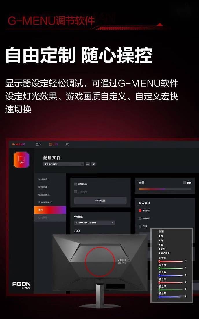 该显示器还支持G-MENU软件自定义调节,玩家可以根据自己的需求调整配置文件、灯光效果、画面滤镜和自定义宏等。同时,显示器自身还支持实时显示刷新率和准星显示,为玩家提供更便捷的游戏辅助功能。